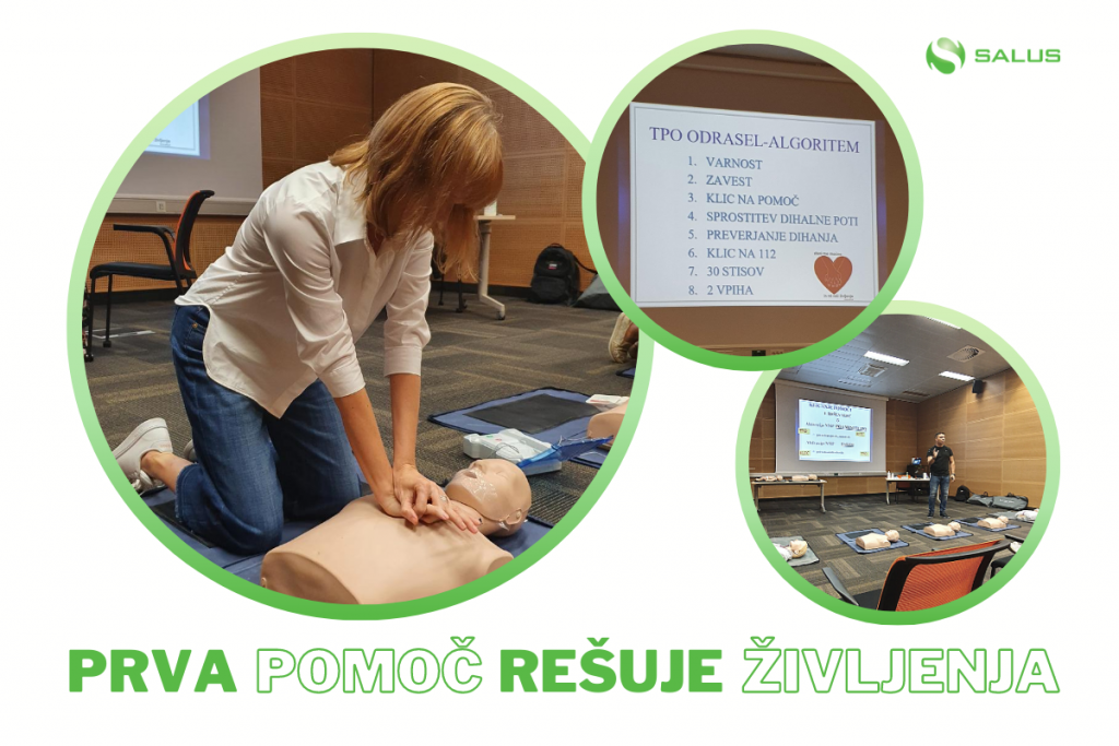 To je razlog, da za zaposlene v Salusu organiziramo redna prostovoljna izobraževanja, da pridobijo znanje o nudenju prve pomoči do prihoda reševalcev, če je to potrebno. Spretnosti prve pomoči lahko pridejo prav doma, na delovnem mestu ali na javnih lokacijah, zato večja ozaveščenost o prvi pomoči prispeva k večji varnosti celotne skupnosti.